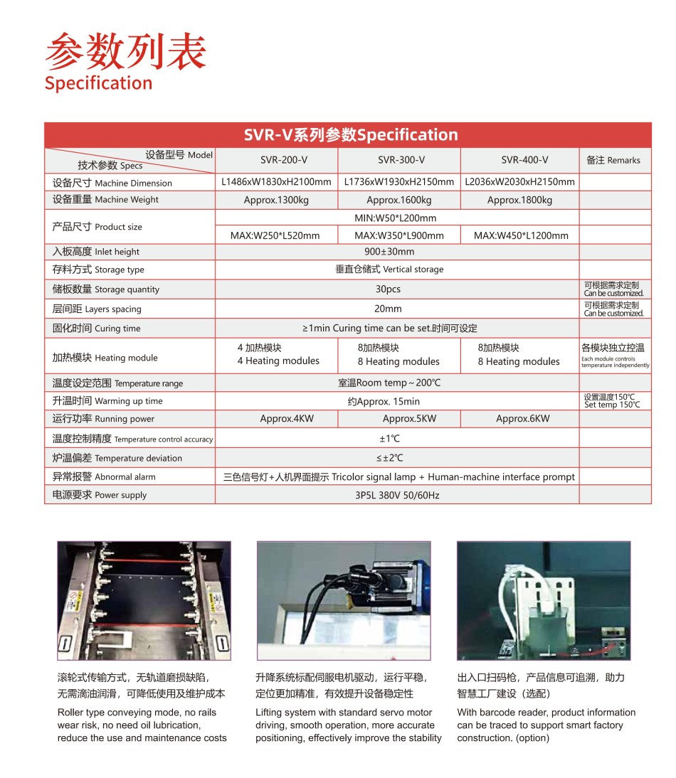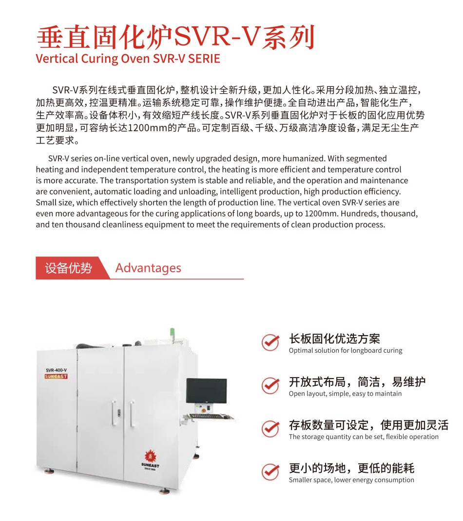 SVR-V系列在線式垂直固化爐,整機設計全新升級,更加人性化。采用分段加熱、獨立溫控,加熱更高效,控溫更精準。運輸系統穩定可靠,操作維護便捷。全自動進出產品,智能化生產,生產效率高。設備體積小,有效縮短產線長度。SVR-V系列垂直固化爐對于長板的固化應用優勢更加明顯,可容納長達1200mm的產品。可定制百級、千級、萬級高潔凈度設備,滿足無塵生產工藝要求。