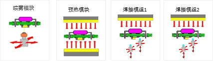 預(yù)熱模塊由底部預(yù)熱、頂部預(yù)熱、焊接保溫模塊組成。各溫區(qū)獨立循環(huán)、獨立控溫。可根據(jù)產(chǎn)品尺寸,自動關(guān)閉產(chǎn)品尺寸范圍外的加熱,節(jié)能簡單。
