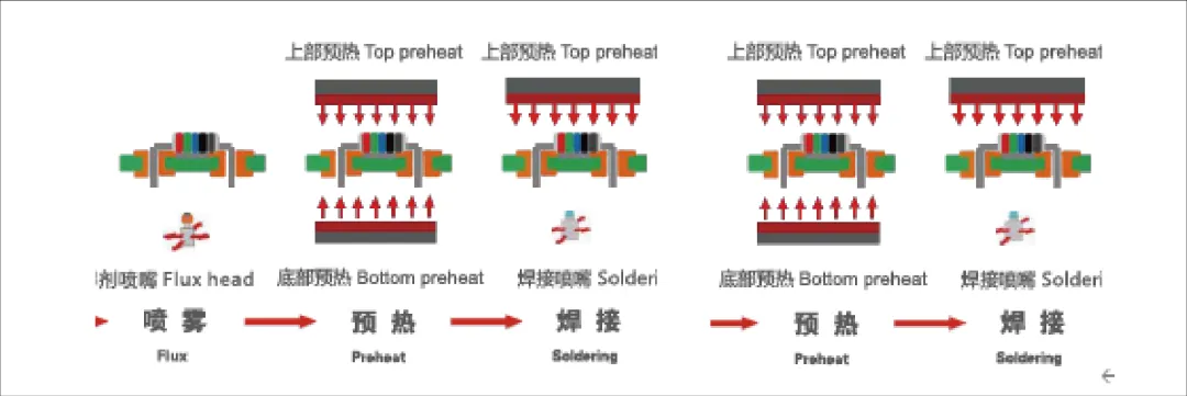 ② 噴霧+預(yù)熱+焊接+預(yù)熱+焊接