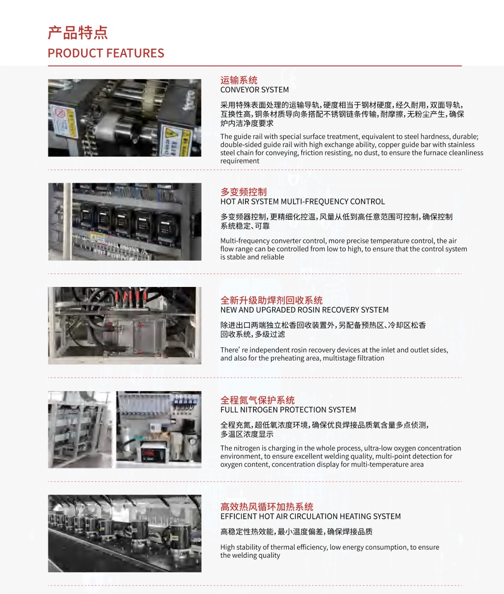6、超耐磨高平穩(wěn)特殊軌道系統(tǒng),自動(dòng)清潔功能,滿足爐腔內(nèi)潔凈度要求,確保產(chǎn)品焊接品質(zhì);